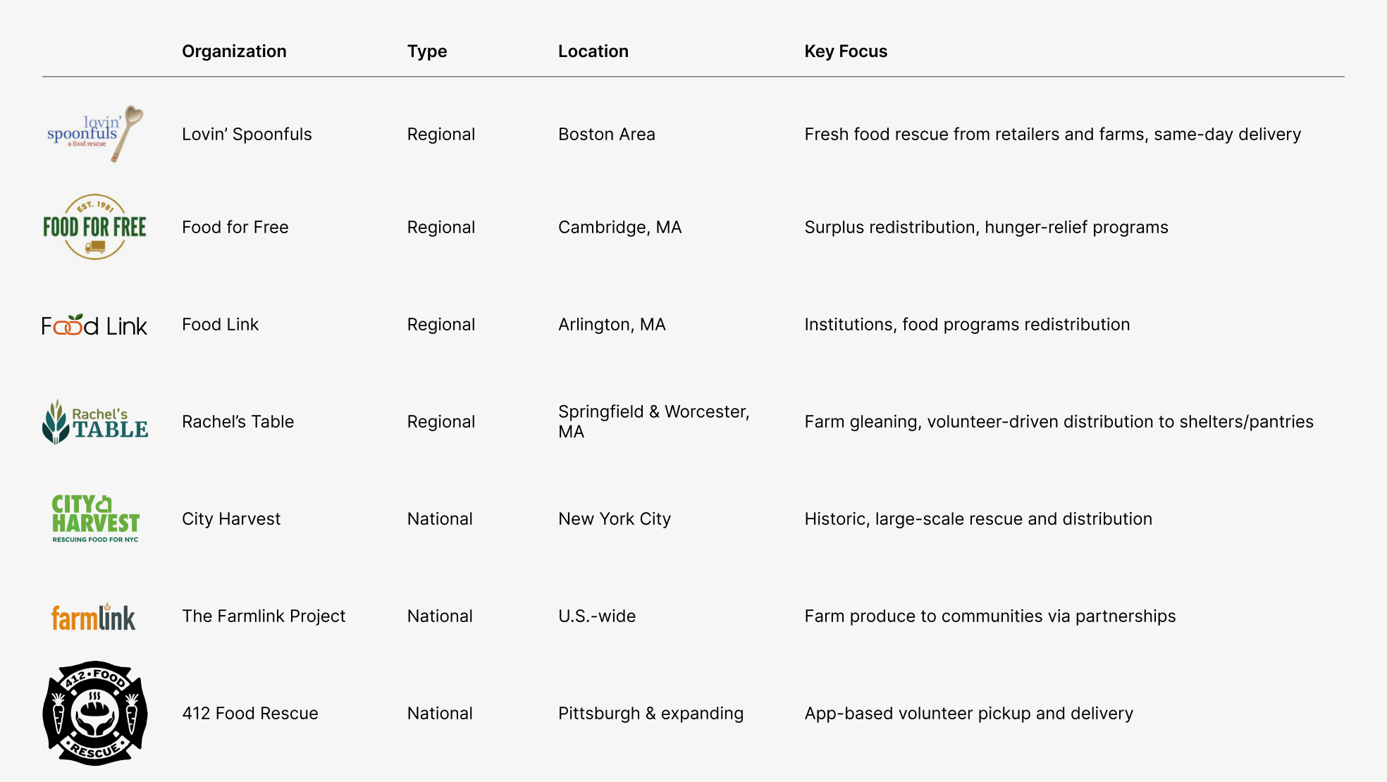 This competitive analysis showed that while competitors often emphasize general food redistribution, Spoonfuls could stand out by highlighting its same-day delivery, impact on food waste reduction, and ability to deliver healthier, fresher food directly to communities. This directly informed the visual identity as well. After assessing competitor logos, I wanted to incorporate more modernity and fresh greens to feel familiar in the space while still standing out.